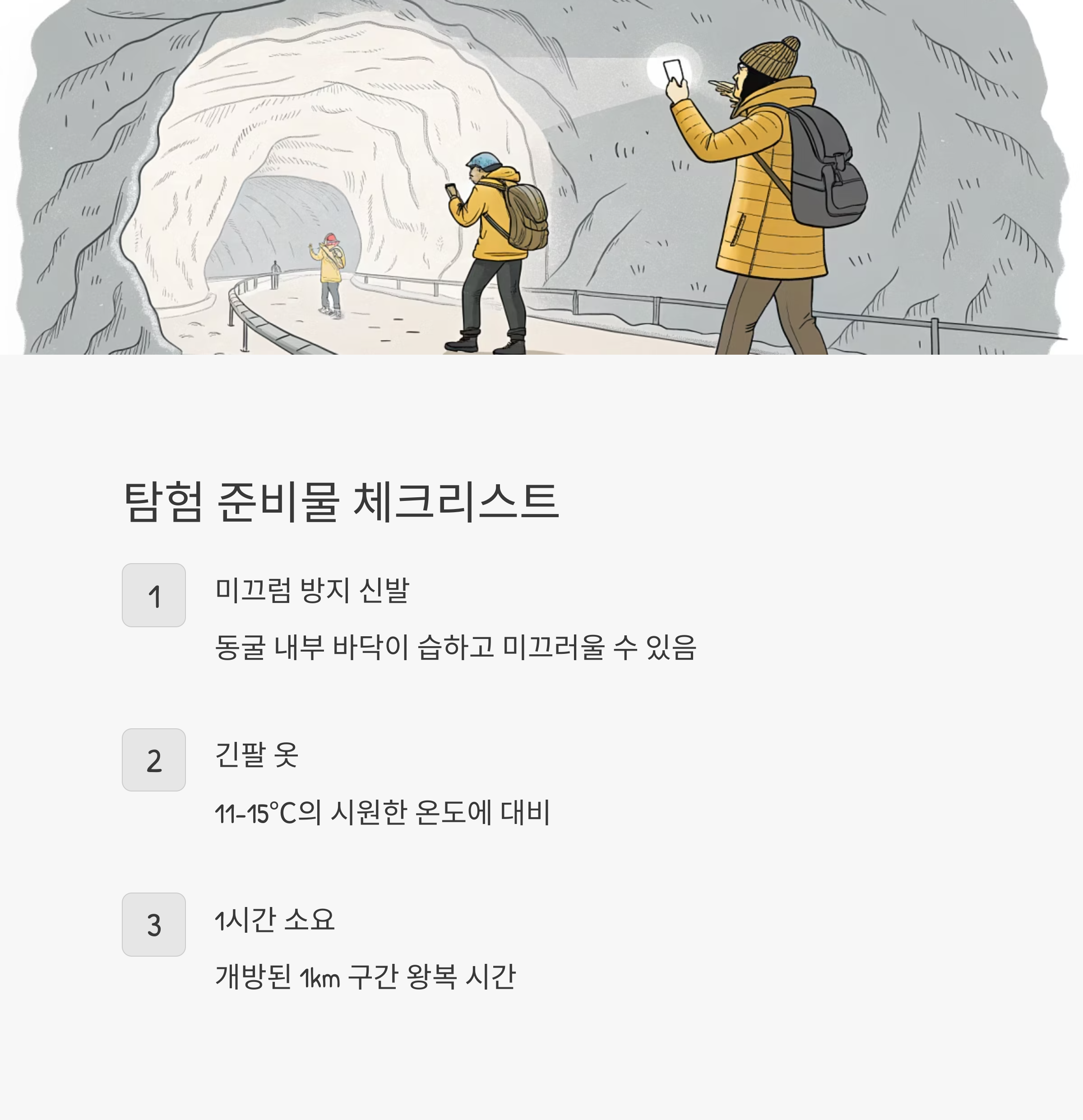 현재 만장굴은 내부 보수 및 안전점검으로 인해 임시 휴관 중이지만, 재개장 시기를 기다리며 미리 준비하면 좋습니다. 동굴 내부는 1km 구간만 일반에 개방되며, 왕복 약 1시간 소요됩니다. 탐방 시에는 미끄럼 방지 신발과 긴팔 옷을 준비하는 것이 좋습니다. 내부가 습하고 바닥이 미끄러울 수 있기 때문입니다. 또한 자연유산 보호를 위해 지정된 구간 외에는 절대 출입이 금지됩니다.
