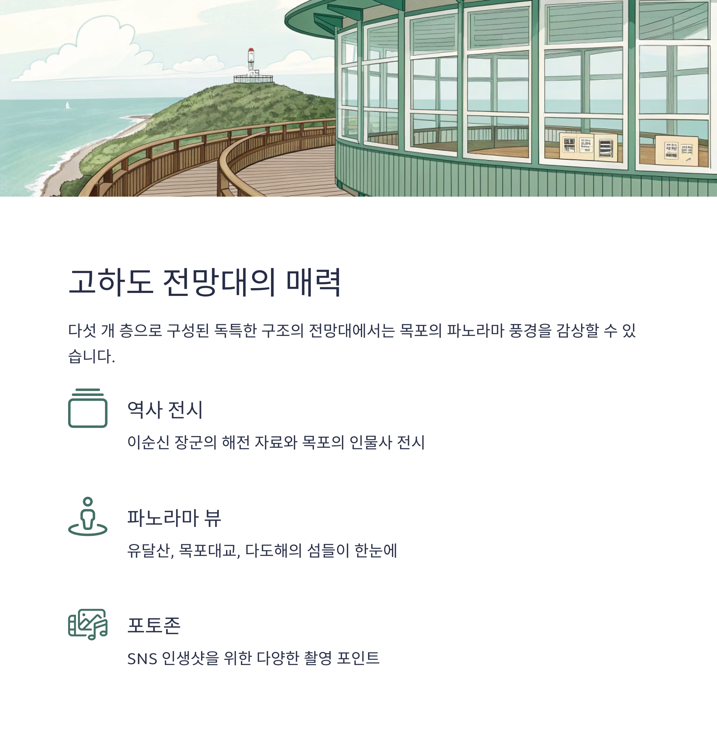전망대 정상에 오르면 유달산, 목포대교, 고하도 용머리, 그리고 다도해의 섬들이 펼쳐지는 파노라마 풍경을 감상할 수 있다. 오르는 길은 나무 데크로 되어 있으며, 중간중간 마련된 포토존은 SNS 업로드용 사진을 찍기에 더없이 좋다. 내부는 전시관을 자연스럽게 경유하며 오를 수 있는 동선으로 설계되어 있어 처음 방문한 이들도 쉽게 이동할 수 있다.