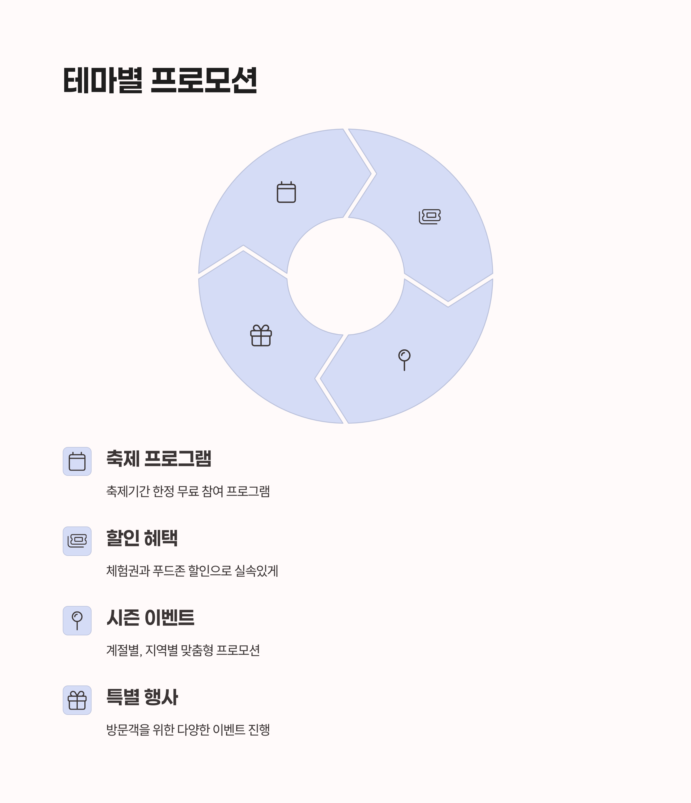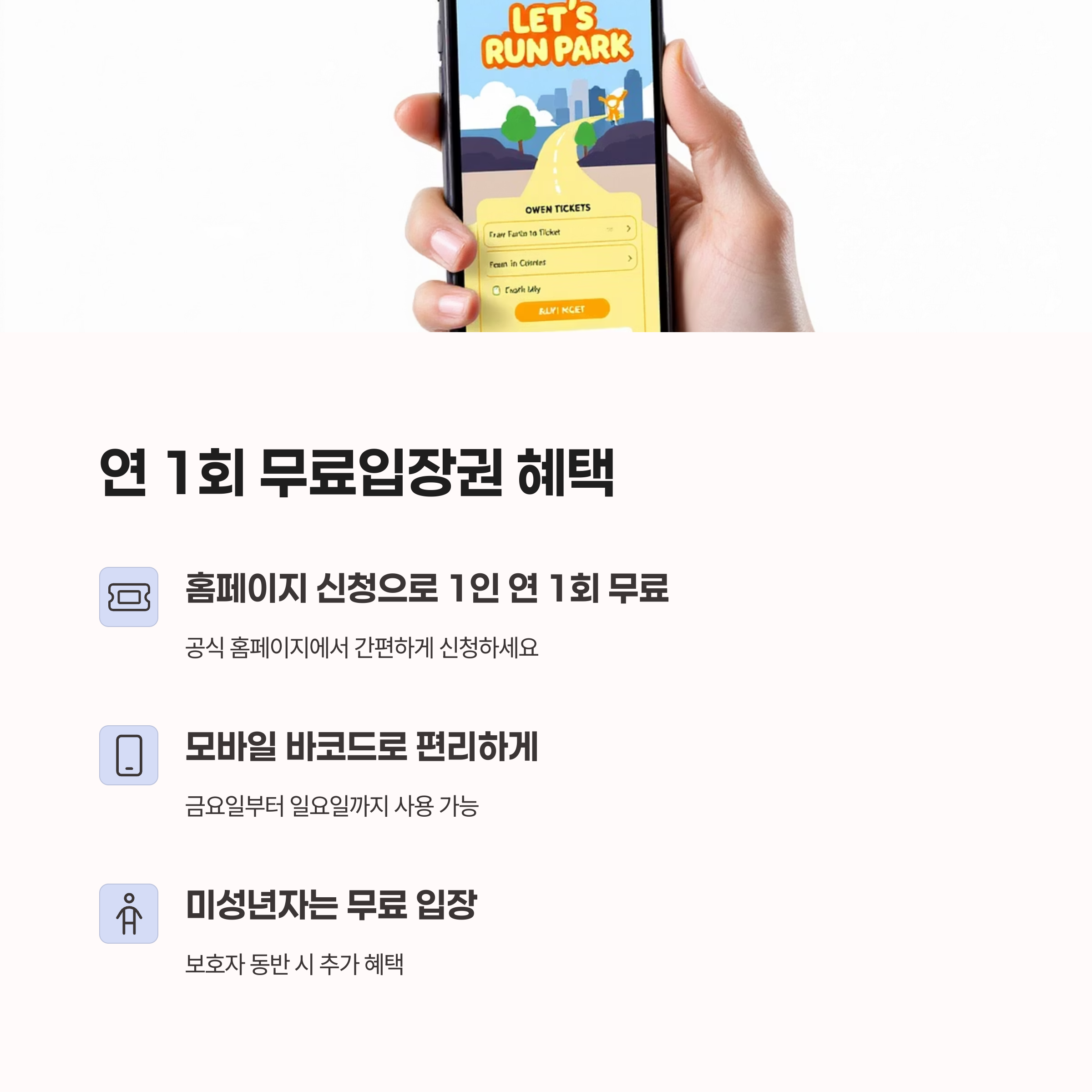 | 연 1회 무료, 축제 시 무료입장 이벤트 진행 | 1시간 이내 무료, 3시간 이하 50% 환불 적용 | 전자카드 회원 20% 할인 적용 가능 |