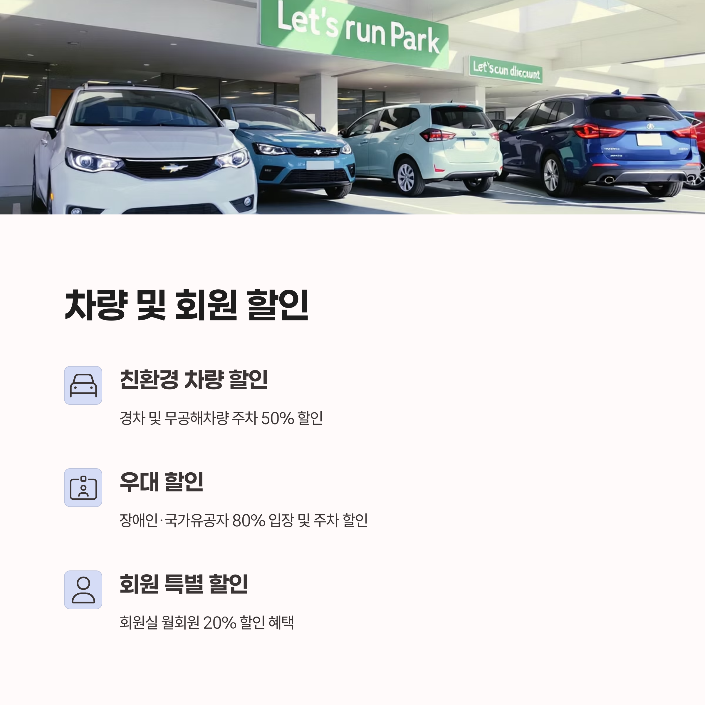| 주차 및 회원 할인 | 주차 최대 80% 할인, 회원실 20% 할인 제공 |