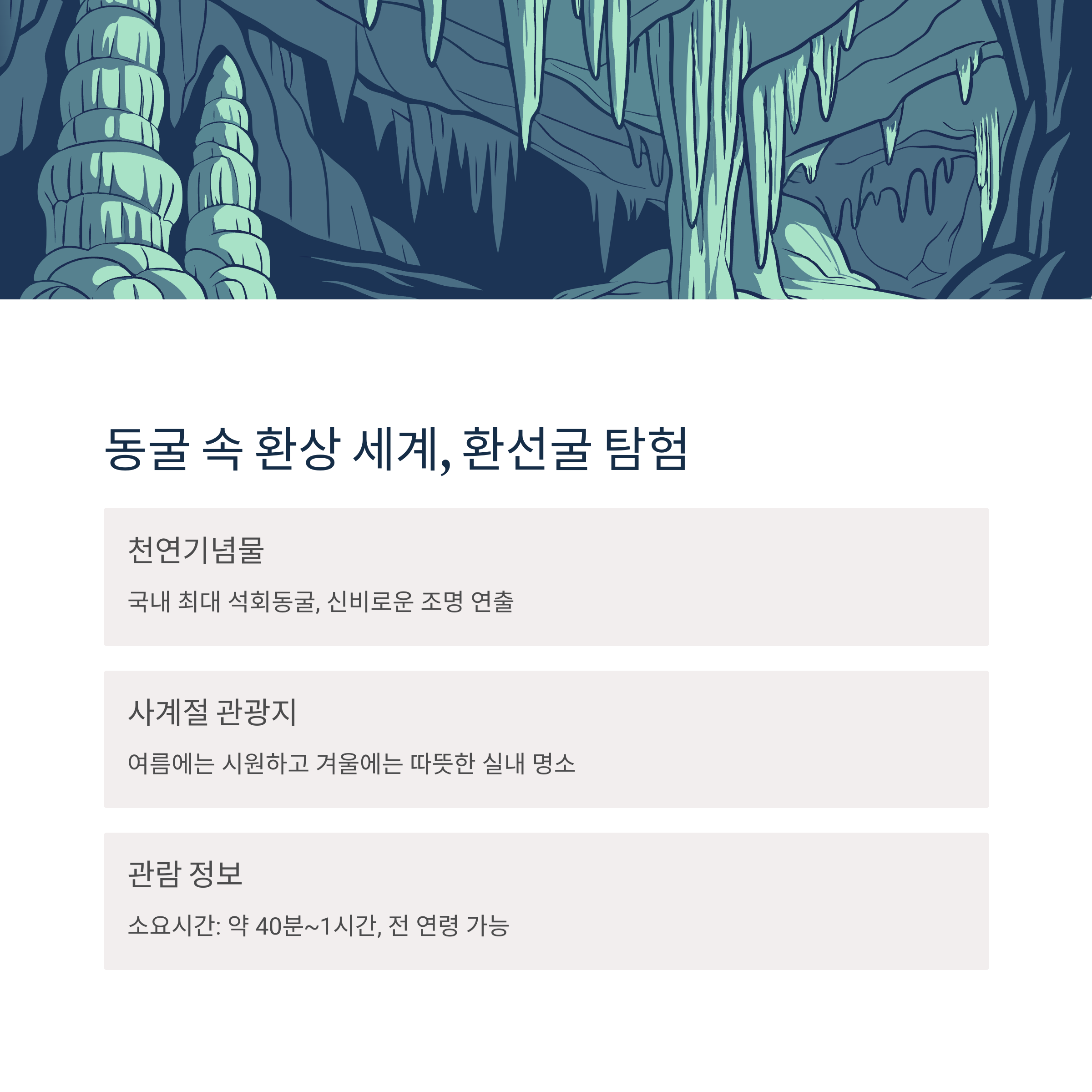 | 환선굴 | 국내 최대 석회동굴 | 약 40분~1시간 |