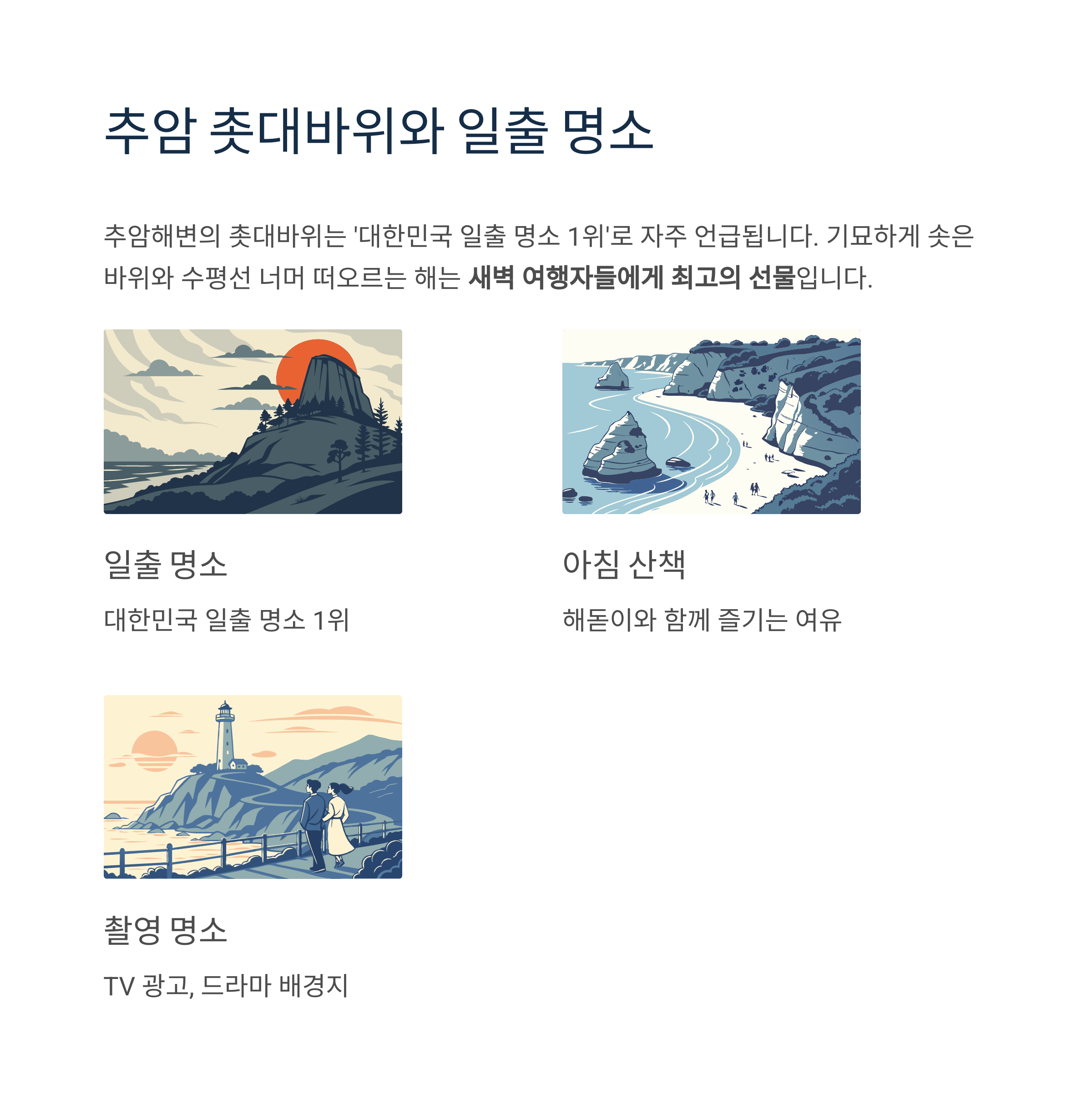 TV 광고나 드라마 배경지로도 여러 번 소개되며, 해돋이와 함께 아침 산책을 즐기기 좋습니다.