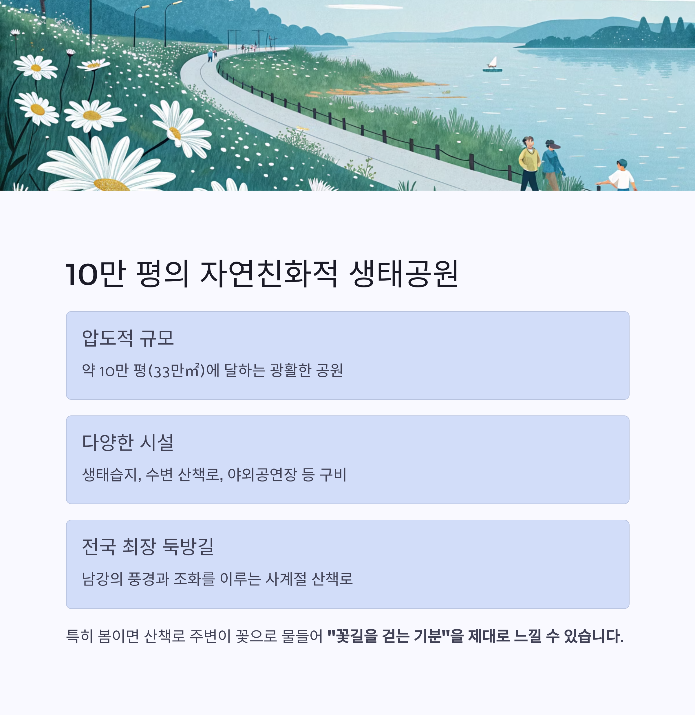 특히 봄이면 산책로 주변이 꽃으로 물들어 "꽃길을 걷는 기분"을 제대로 느낄 수 있습니다.