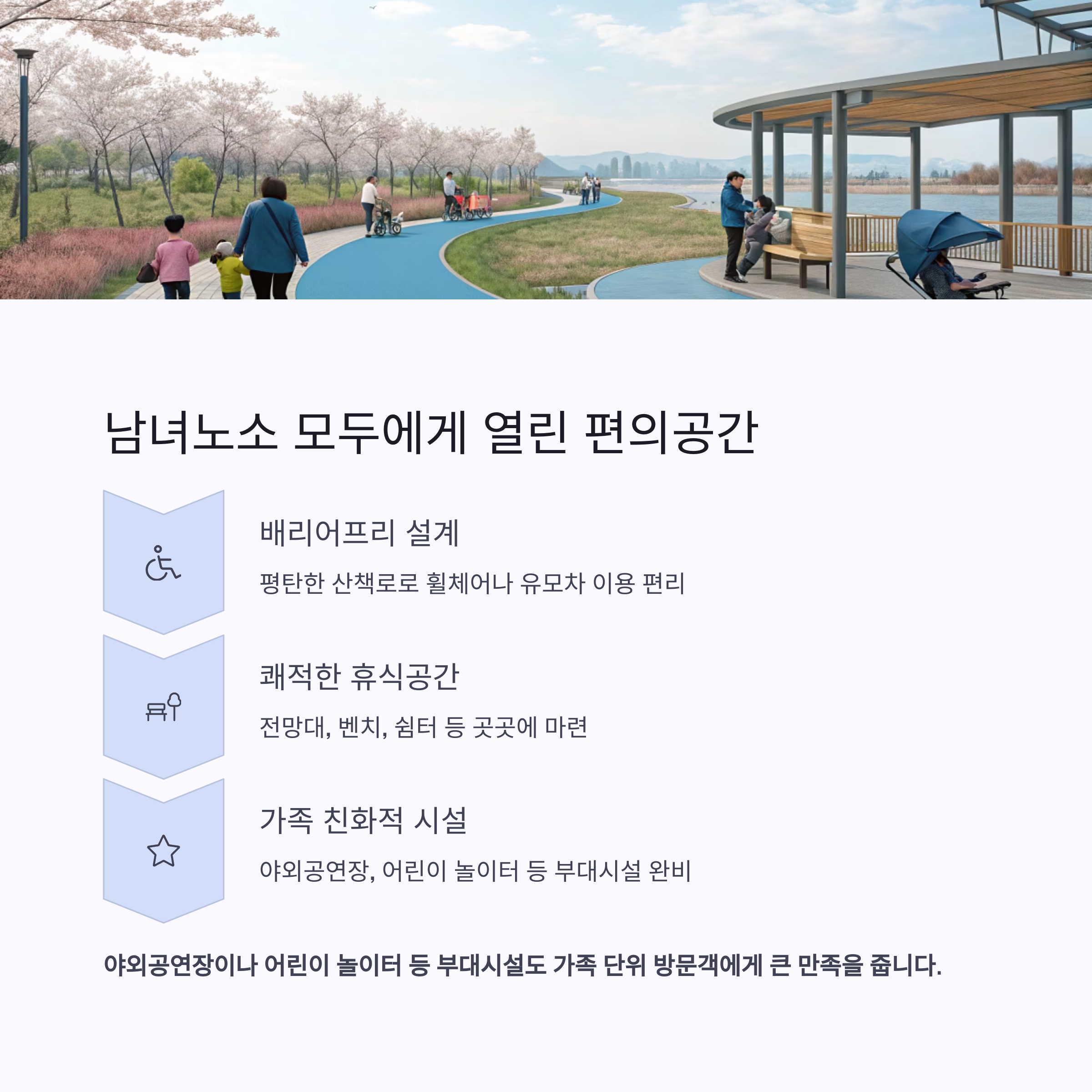 전망대, 벤치, 쉼터 등 쾌적한 휴식공간이 곳곳에 마련되어 있어 장시간 머무르기에도 부담이 없습니다.
