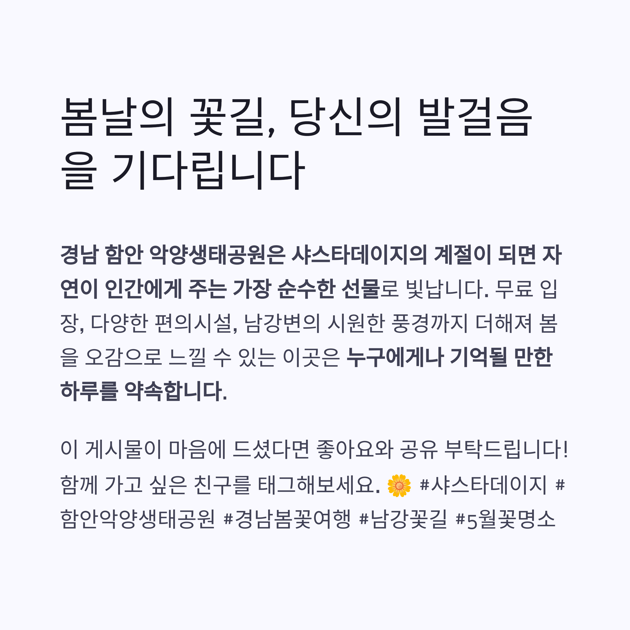 봄을 오감으로 느낄 수 있는 이곳은 누구에게나 기억될 만한 하루를 약속합니다.